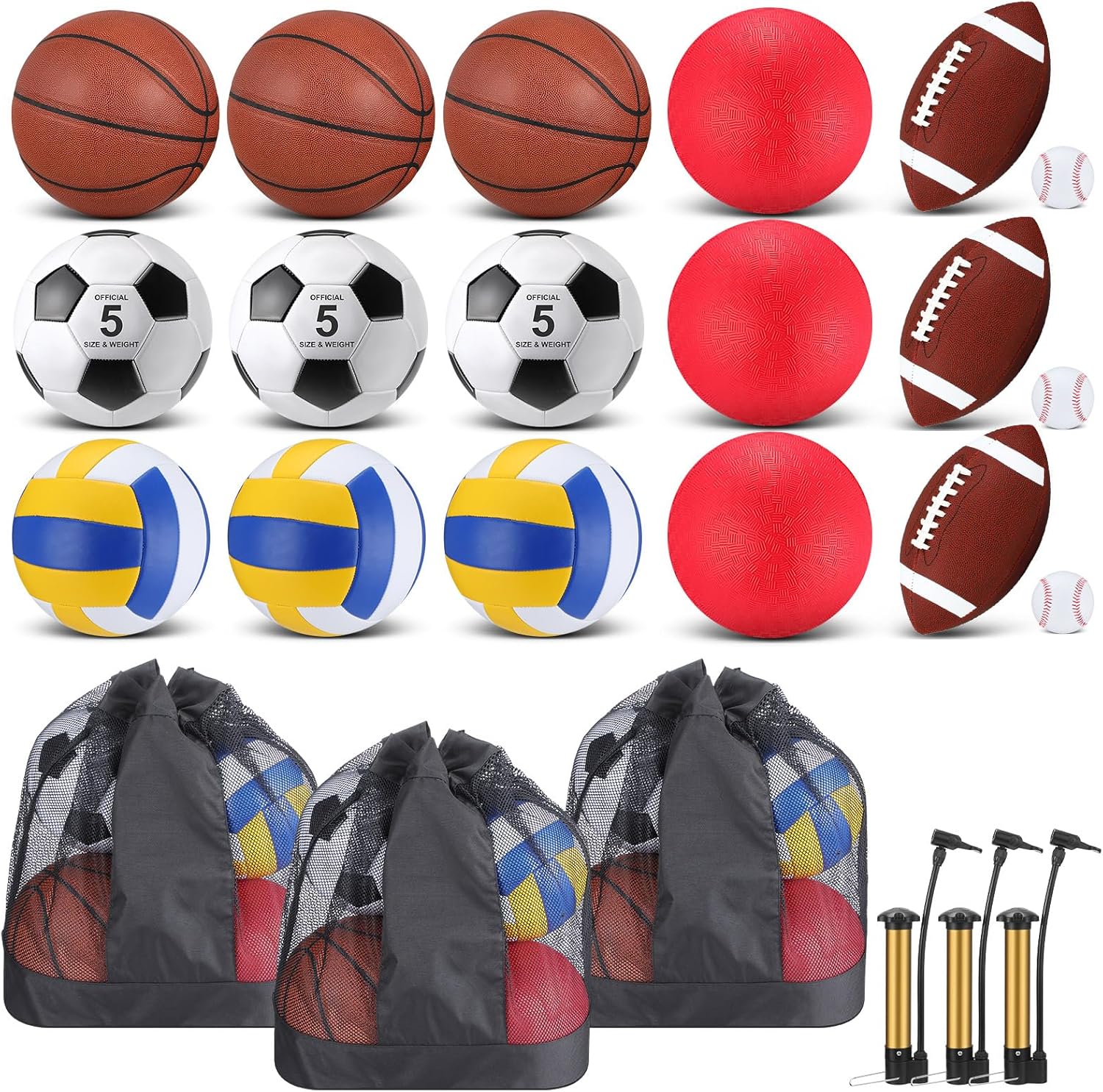 Comes with Basketball, Football, Football, Volleyball, Soccer, Baseball, Ball pump, and Bag!